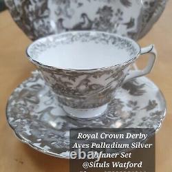 Royal Crown Derby : Palladium Aves 5 Piece Set. Includes ONE of each the following. 10"/ 27cm Dinner Plate 8" / 21.5cm Salad Plate 6 / 16cm Side Plate. Made in England Fine Bone China. Unveiling Aves Palladium, the latest introduction by luxury fine bone china specialists Royal Crown Derby.
